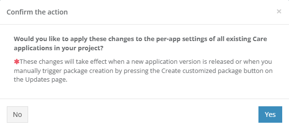 The Yes button applies the settings to all existing Care applications, while the No button applies them only to new ones.