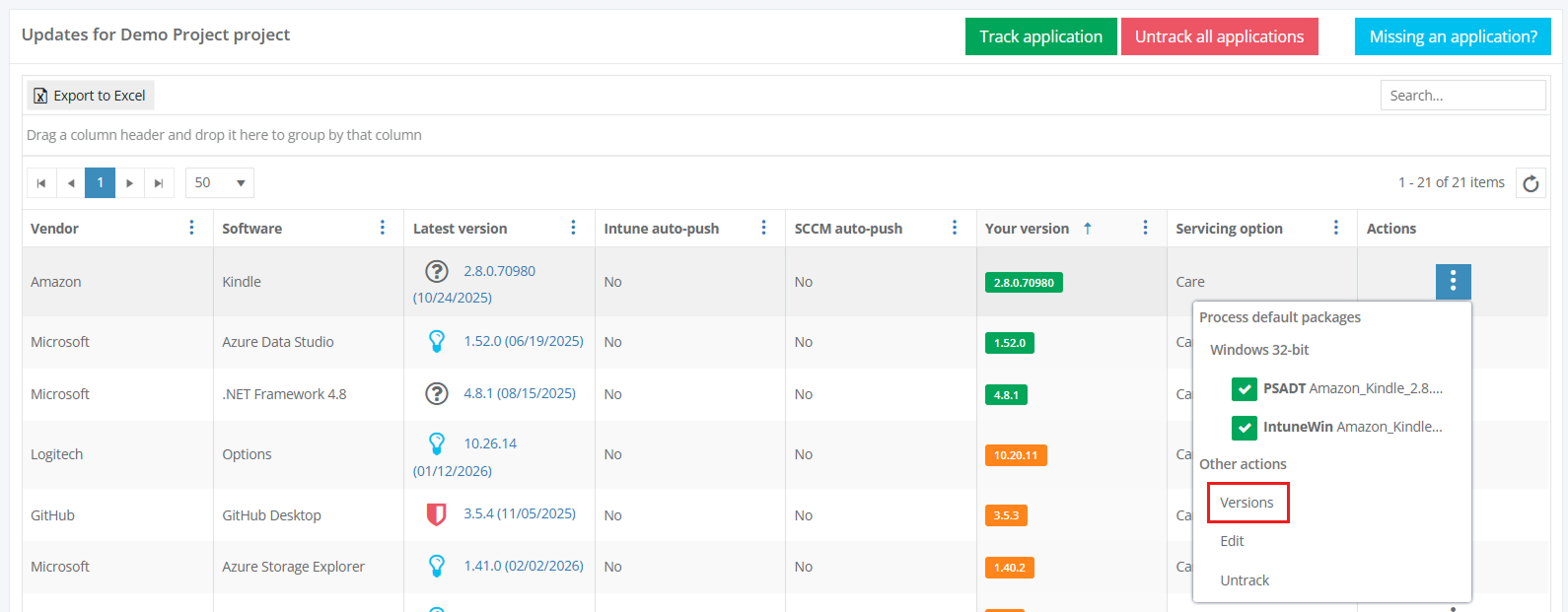 - Actions column > Versions button > Process package column > Select the application’s version > Select the packaging format > Download Package/Push to SCCM as Application / Push to Intune buttons > Confirm update software > Yes button).