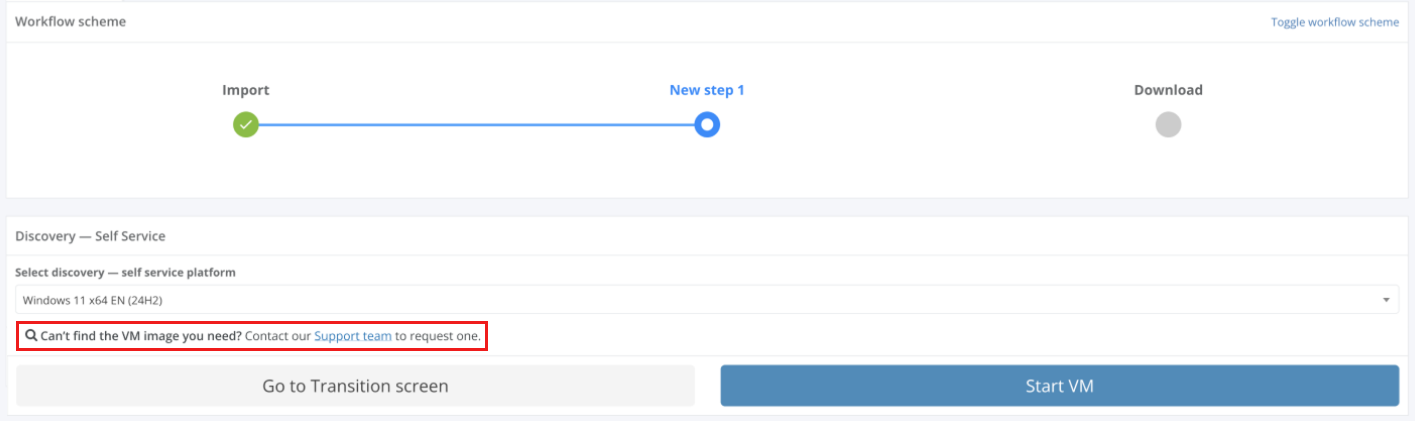 The option to request a virtual machine image is available under the Can’t find the VM image you need? Contact our Support team to request one link.