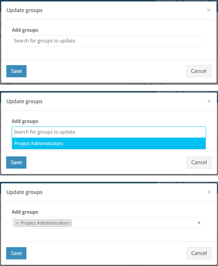 A user or group can be selected on the following screens. The Save button applies the changes.